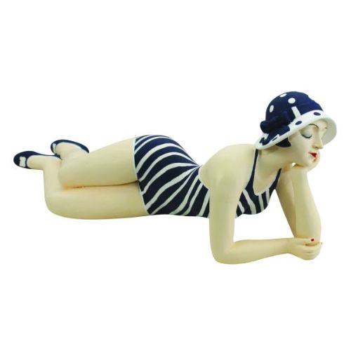 BATHING BEAUTY FIGURINE... Navy Blue and White Striped Bathing Suit - Collectible Beach Girl Laying Down - MEDIUM SIZE