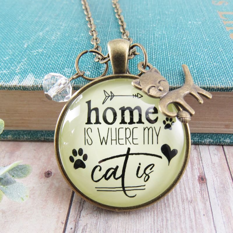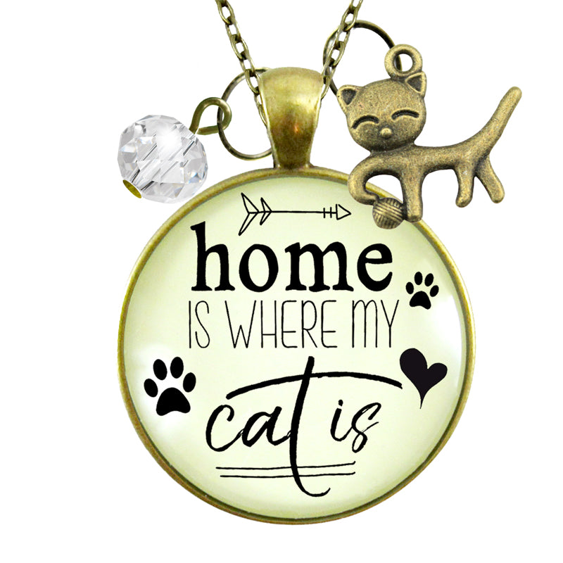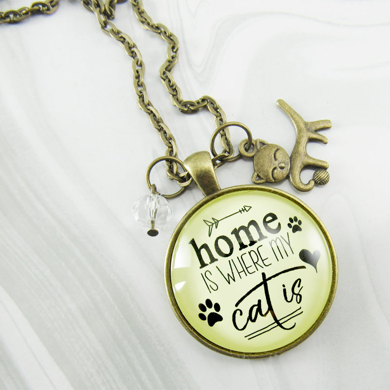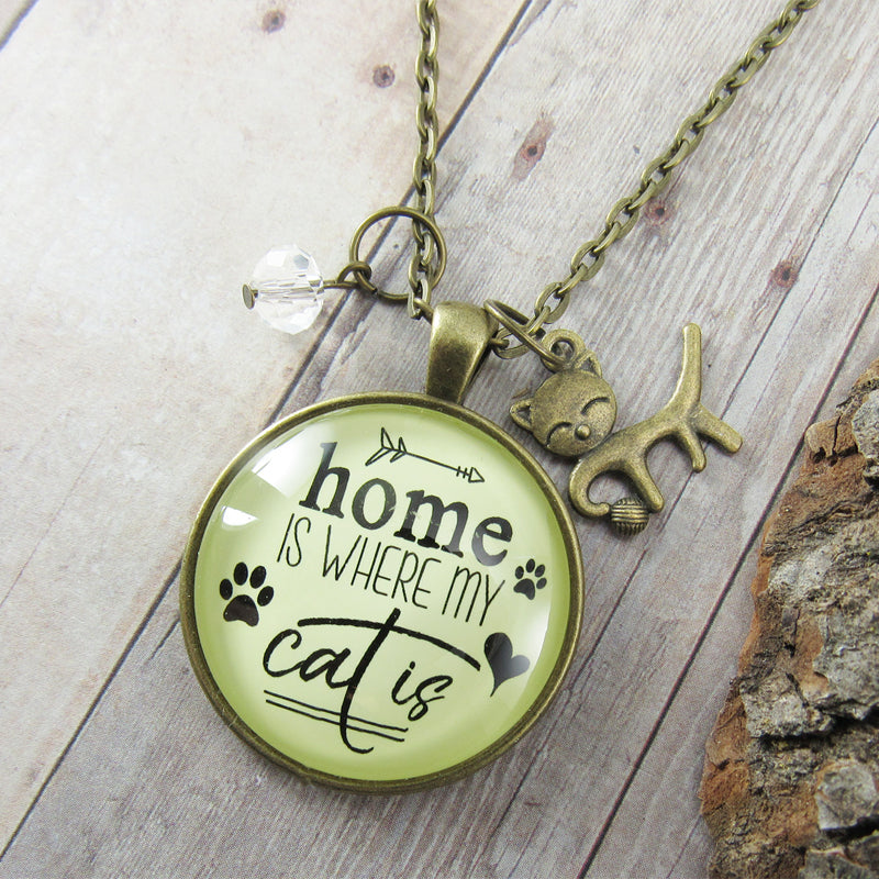 Show your love for your kitty cat with this beautiful vintage bronze style necklace. Glass pendant showcases a vintage-style cream background wit the words "home IS WHERE MY cat is". Also hanging from the 24" chain you will find a cute rustic bronze-finish metal cat charm and a glass bead charm to finish it off. A great daily reminder that you kitty cat is there for you.